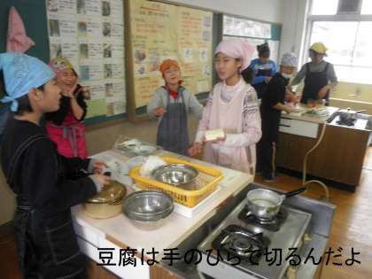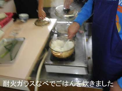 耐火透明ガラス鍋でごはんを炊いて,炊きあがっていく様子を観察。みそ汁は各班で具を選んで作ります。豆腐・おあげ・さつまいも・だいこん等々。