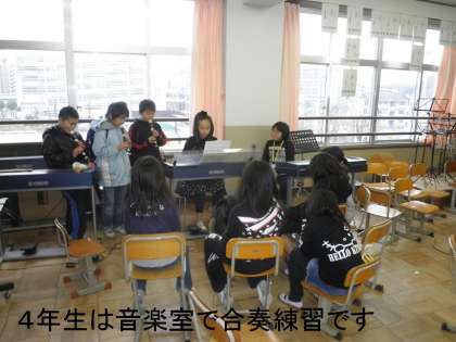 宿題を終わらせた後,4年生は「6年生を送る会」の練習に音楽室に行き,合奏練習をしていました。