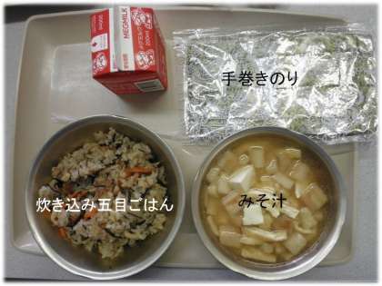 「炊き込み五目ごはん」「みそ汁」「手巻きのり」「じゃこ」