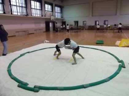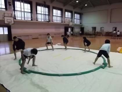新しいマット土俵を購入していただきました。その土俵で今日は稽古しました。初めて使用するマット土俵なので段取りよく準備(左上写真)することができませんでした。土俵が完成するとさっそく稽古を開始しました。新しいマット土俵で初稽古をしたので部員みんな普段以上に気合を入れて稽古をしていました。