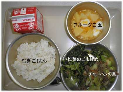 「むぎごはん」「チャーハンの具」「小松菜のごま炒め」「フルーツ白玉」