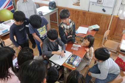 えんぴつ、水筒の底、のり等々、子どもたちは、身の回りにあるものを使ってじっくり円を描きました。