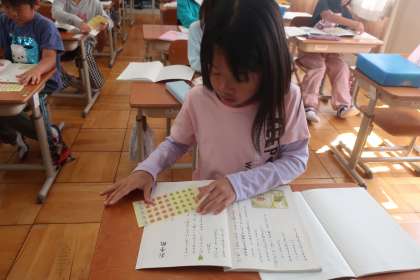 登場人物ごとにキャラクターシールを貼ることで、さらになりきって音読することができたようです。