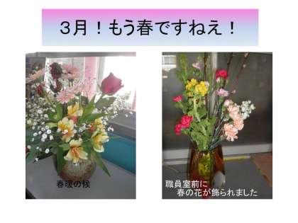 職員室前には,チューリップや菜の花など、春の花がきれいに活けられています。