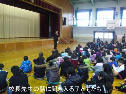 今日の校長先生のお話しは,卒業式に歌われるようになった「旅立ちの日に」という曲が作られた背景を紹介され,「歌」というものは,歌わされるという気持ちでなく,自ら歌おうと意欲的な気持ちになることが大事であり,歌によってみんなの心がまとまり,落ち着いた明るい学校に変わるというお話しでした。