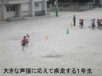 元気な大きな声援に応えて,一人トラック一周を疾走しました。