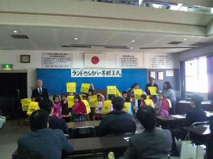 1年生の子どもたちが,ランドセルに黄色いカバーをつけて登下校することで,ドライバーによく目立ち,交通事故防止につながっています。また,贈呈式の中で山科警察署の署長さんが,この取組によって子どもたちの交通事故がかなり減ったとおっしゃっていました。