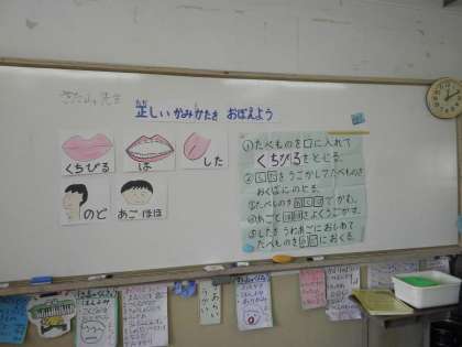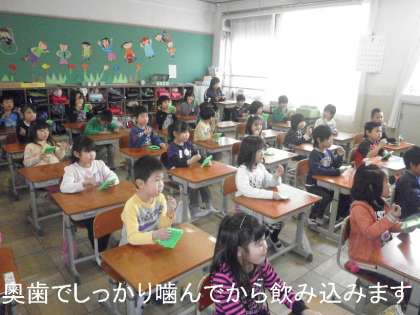 給食時間の前に,栄養教諭の北山先生に,正しいかみ方を教えてもらいました。