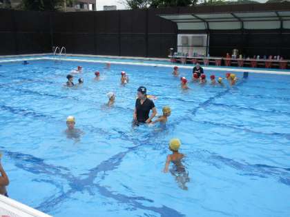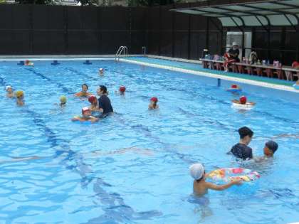毎年恒例の行事です。園児たちにとってはびっくりするほどの大きなプールで,先生たちと歓声をあげながら楽しんでいました。
