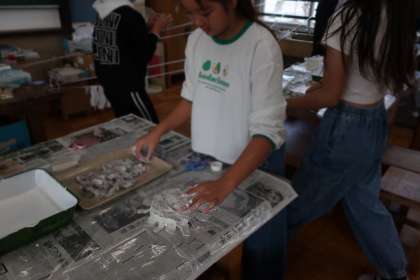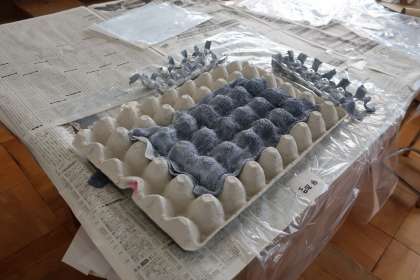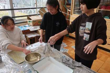 布を液体粘土に浸し、好きな形に固めます。