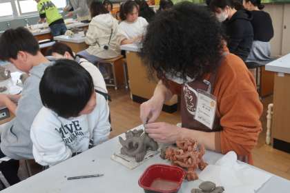 ゲストティーチャーとして陶芸家の先生をお招きして,卒業制作を兼ねてシーサーを作りました。シーサーの起源や意味から丁寧に教えていただき,イメージをふくらませながら形を作りました。
