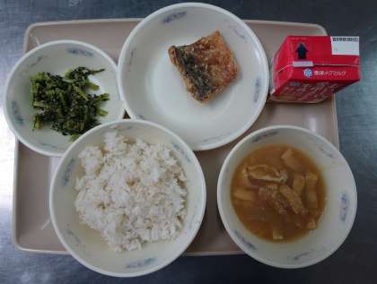 今日の給食は「麦ごはん」「さばのたつたあげ」「だいこんばのごまいため」「みそしる」です。