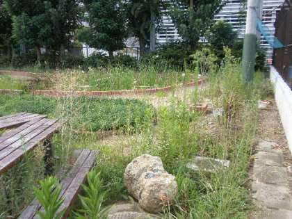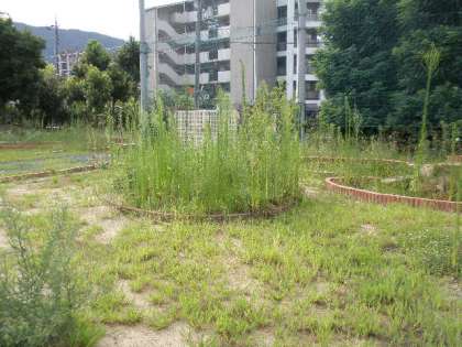 学校のふれあいビオパーク(ビオトープ)は,すっかり様変わりしました。一般には雑草と言いますが,ビオトープにとっては自然いっぱいの大切な植物が大きく成長しています。また,隣の学校園(畑)にとっては,やっかいな雑草??が多い茂って2年生や4年生が育てている「サツマイモ」や「ツルレイシ」は,隠れてしまっています。