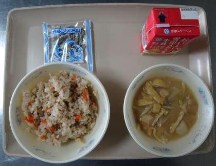 今日の給食は「炊きこみ五目ごはん」「牛乳」「みそ汁」「じゃこ」でした。