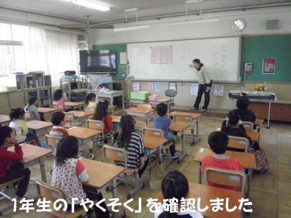 どちらのクラスも「1年生のやくそく」を確認しました。そして,持ち物点検も一緒にしました。