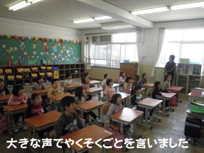 「お友だちとなかよくする!たたいたりしない!」などのやくそくごとをみんなで大きな声で言いました。