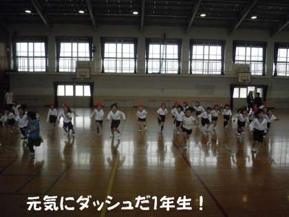 入学してはじめて体育の服に着替え,体育館で1組2組一緒に合同体育をしました。