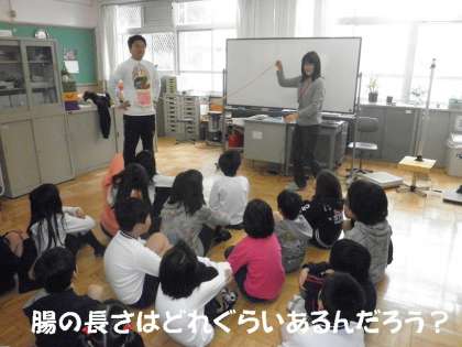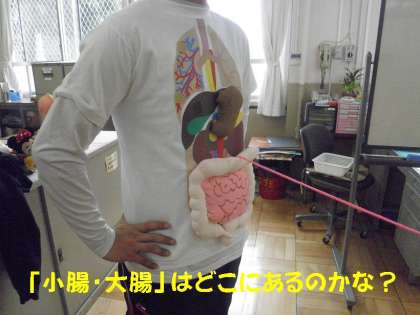 保健室で春の身体計測がありました。身長や体重をはかる前に,担任の先生が体の中を説明するTシャツを着て,保健室の先生が腸のはたらきについて教えてもらいました。