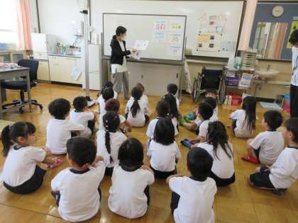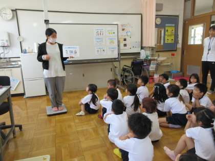 大きくなったかな。保健室の上野先生のお話を聞いて、保健室のお約束を守って、測ってもらいました。