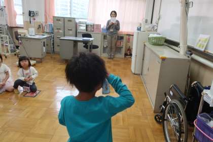 片目ずつハンカチで目を隠しながら、真剣にこたえていました。