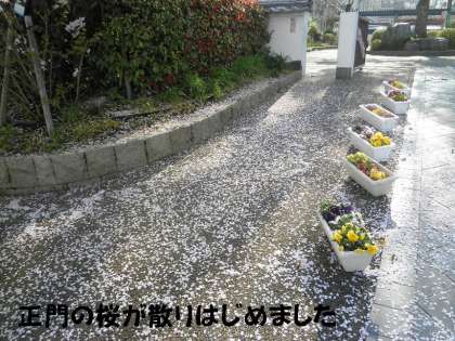 朝,子どもたちが登校する前の正門前には,桜の花びらでジュウタンができていました。昨日の雨で散った桜がです。
