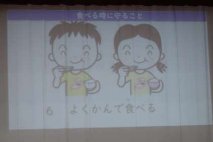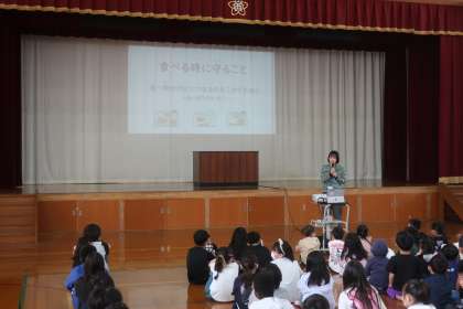 朝会後に、栄養教諭から『給食を食べるときに守るべきこと』の話がありました。