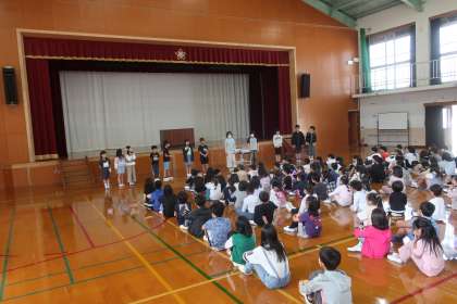 1年生から6年生までの代表委員が全校の前で自己紹介。