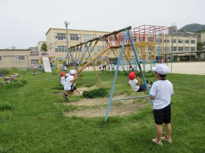 体育の時間に、ルールを守って遊具で遊んでいます。