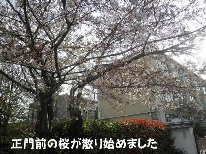 正門前の桜(ソメイヨシノ)が散りはじめました。醍醐寺の桜に合わせて,花びらがどんどん散って,濃い緑の葉が出始めています。残念ですがしかたないですね。でも,これから葉桜もきれいです。