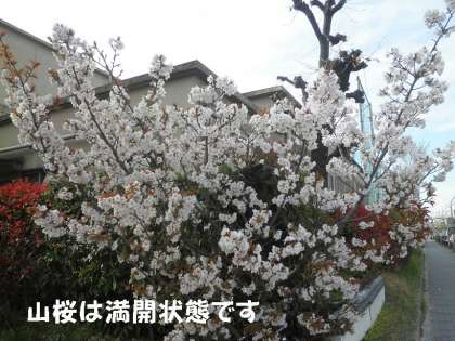 隣の山桜は,開花が1週間遅れていたので,今が満開です。花びらが大きくきれいです。