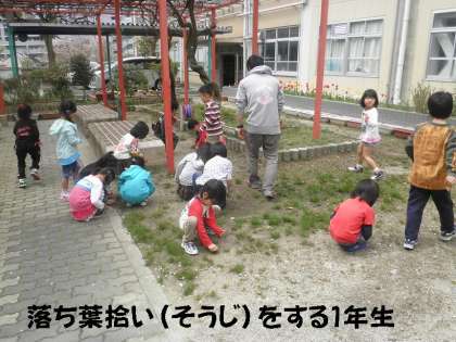 そうじの時間に,一人20〜50枚の葉っぱを拾ってきれいになりました。教室のおそうじは,6年生のお兄さん,お姉さんがしばらく手伝ってくれています。
