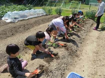 今日は学校園にピーマン・ナス・きゅうりを植えました。