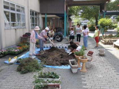 屋外での作業であり,汗だくになりながらの大変な作業でしたが環境厚生部のお母さん方と放課後まなび教室でお世話になっている園芸のプロの原田さんご夫妻と,そして子どもたちのお手伝いもあり,きれいに植え替えが終わりました。