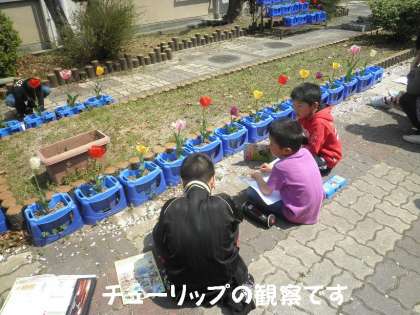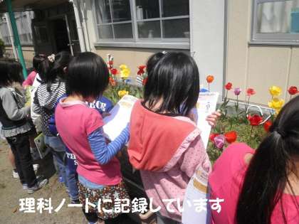 3年生になって,新しく理科を習い始めました。今日は,いいお天気の下,中庭に出て,チューリップの観察をしました。