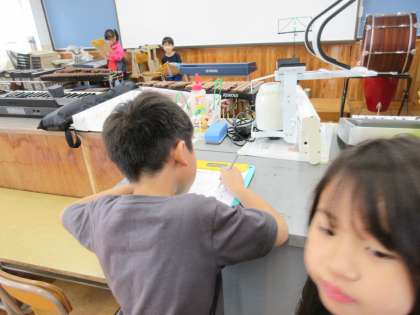今日は、音楽室の横の「楽器室」と「図工室」に行って、見つけたものをよく見て絵を描きました。