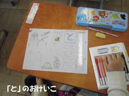 ひらがなの学習で「へ」「く」「て」など,1回で書ける字の次は,「と」のように2回で書く字の練習です。