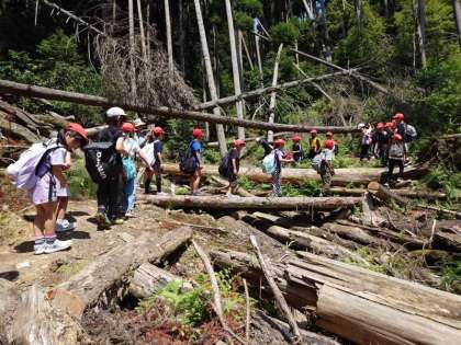 若干荒れた登山道もありますが、みんなで声を掛け合って山頂をめざしています。