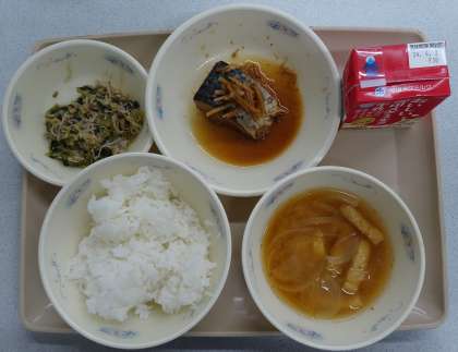 今日の給食は「ごはん」「牛乳」「さばのしょうが煮」「もやしと小松菜のごま煮」「みそ汁」でした。