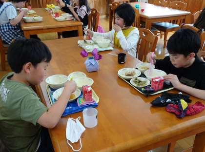 4年生はランチルームで給食でした。いつもとは少し違う気分で、楽しみながら食べていました。