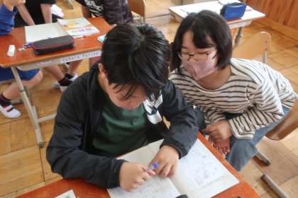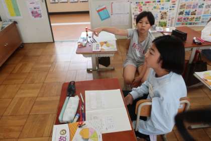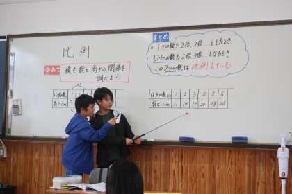 2つの文章問題について、『比例する』か『比例しない』のか、グループで話し合ったことを全体に発表していました。