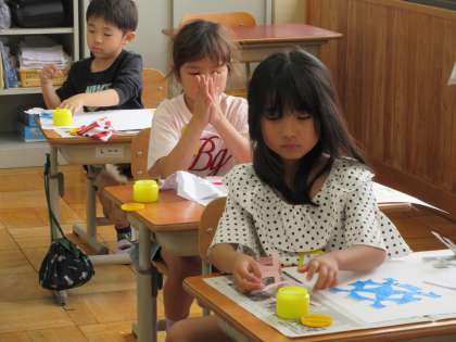 1年生は、先週切り取った紙を、画用紙に貼り付けました。