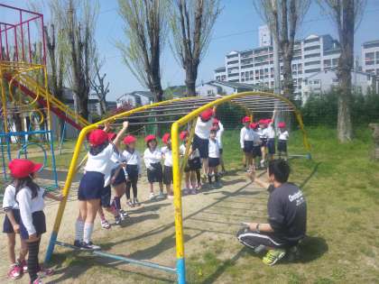 総合遊具ののぼり棒や雲梯(うんてい)の使い方を教えてもらいました。