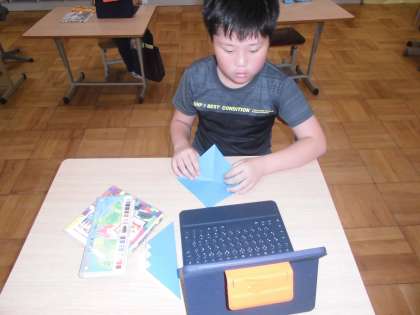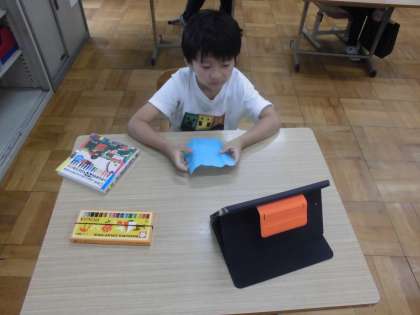 教室の雰囲気をよりよくしようと、GIGA端末を使って描きたい絵を見つけて画用紙に描いたり、動画を見ながら折り紙を折ったりしました。