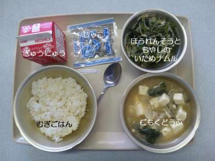 今日の献立は,『五目豆腐』『ほうれん草ともやしの炒めナムル』『じゃこ』『麦ご飯』『牛乳』です。