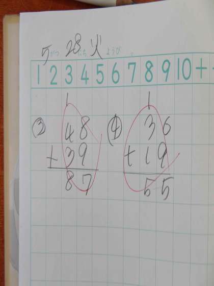 くらいを揃えて縦に書くことや、くり上がりの方法を確かめました。