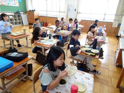 今日の給食は「麦ごはん」「新じゃがいものかきあげ」「切干大根のごま煮」「若竹汁」です。月に一度の、和食をあじわう「なごみこんだて」の日です。