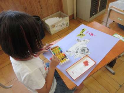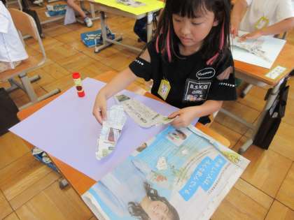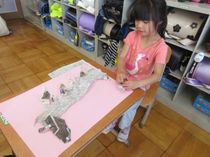 遠足で見た動物を思い出しながら新聞を置いたり貼ったりして作品を作りました。