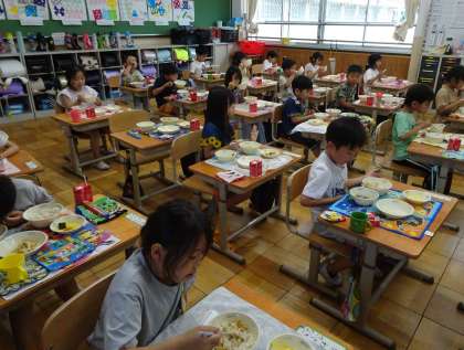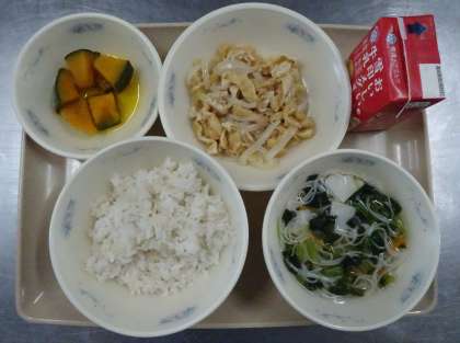今日の給食は「麦ごはん」「牛乳」「きつね丼(具)」「かぼちゃの煮つけ」「七夕そうめん」でした。