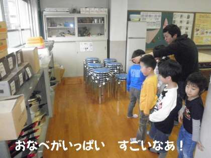 家庭課室では,担当の先生の説明を聞いたあと,中を自由に見て回りました。お鍋や食器,ミシンにアイロン,洗濯機など,家にもあるものばかりですので,名前はしっかり言えました。でも,お鍋や食器の数の多さに驚いていました。