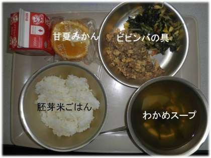「胚芽米ごはん」「わかめスープ」「ビビンバの具」「甘夏みかん」